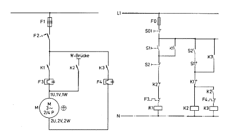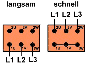Es wird normalerweise die sogenannte Dreieck/Doppelstern- Schaltung angewendet. Seltener und nur bei der Dahlandermotoren für Lüfterantriebe die s.g. Stern/Doppelstern- Schaltung. Die äußere Verschaltung der Motoren ist aber in beiden Fällen gleich. Die untenstehende Zeichnung zeigt die grundsätzliche Schaltung an einem Dahlandermotor. Wird der Motor von einem Schaltgerät geschaltet, dann gilt die Zeichnung sinngemäß.